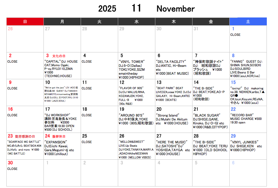 第四土曜日19:00 OPEN 23:30 CLOSE
